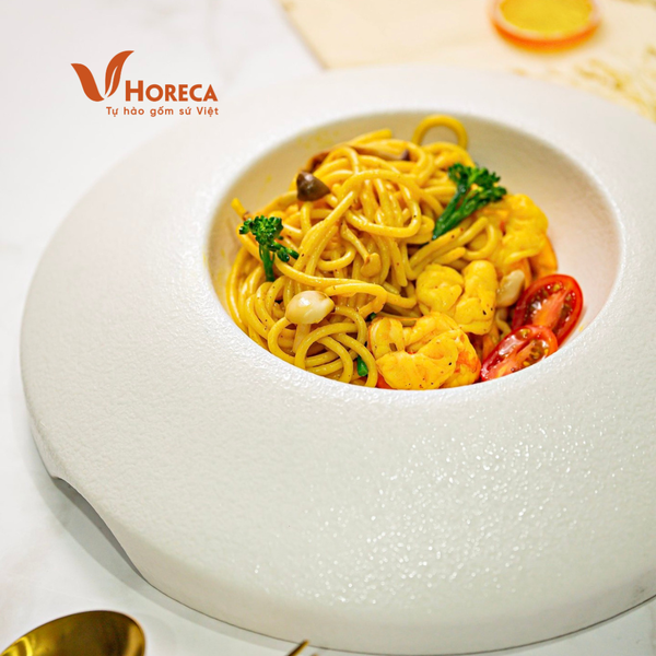 Mỳ ý sốt tôm nóng hổi đặt trên khay tròn của V Horeca vừa tinh tế vừa hấp dẫn