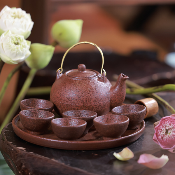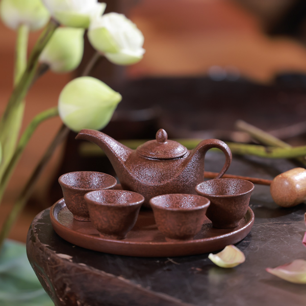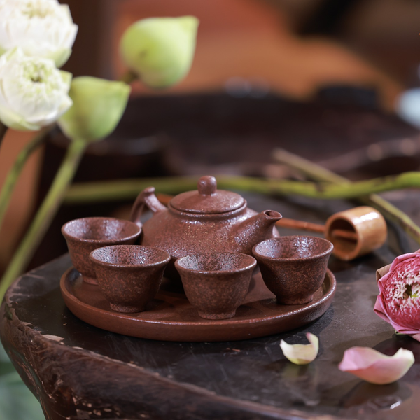 Mỗi chiếc ấm, tách, chén trong bộ sưu tập là kết tinh của sự chỉn chu – được làm từ đất tử sa quý hiếm, phủ lớp men phun hạt độc đáo, mang gam nâu trầm tự nhiên: mộc mạc mà không giản đơn, tinh tế mà không phô trương.